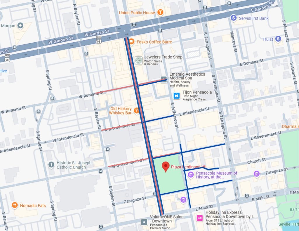 Shifting for New Palafox Project: While Palafox Street will be temporarily closed during construction, Gallery Night will remain active every month, shifting its primary activity areas to surrounding streets and plazas. The newly released map highlights event zones centered around Plaza Ferdinand, Government Street, Zaragoza Street, and Museum Plaza, clearly outlining performance areas, vendor locations, food truck zones, and pedestrian flow.