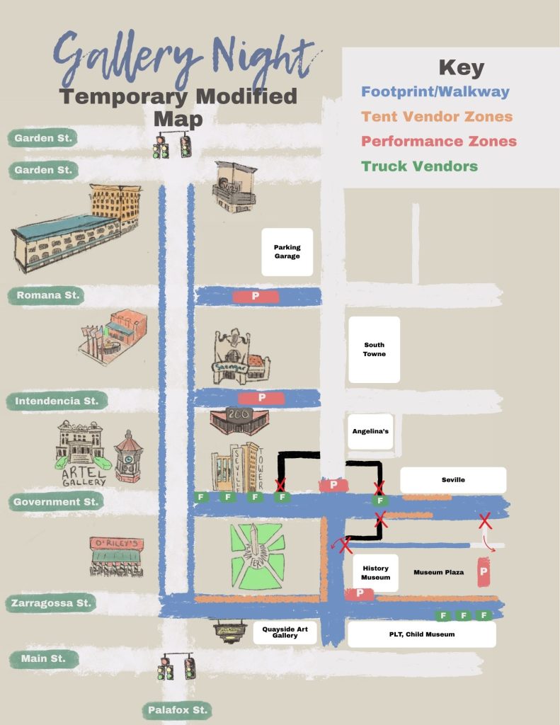 Community Partners Zone: In response to the construction period, Gallery Night is also introducing a Community Partners Zone within the event footprint. This option allows downtown merchants to set up within the mapped event area, helping them remain visible and engaged with Gallery Night foot traffic while Palafox Street is temporarily offline.