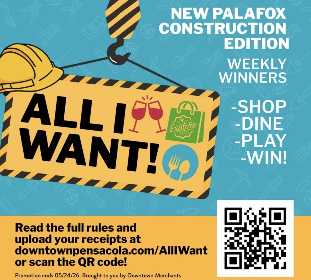This promotion encourages customers to shop, dine, and support downtown businesses during the New Palafox construction period while giving them the opportunity to win weekly prizes and a grand prize.