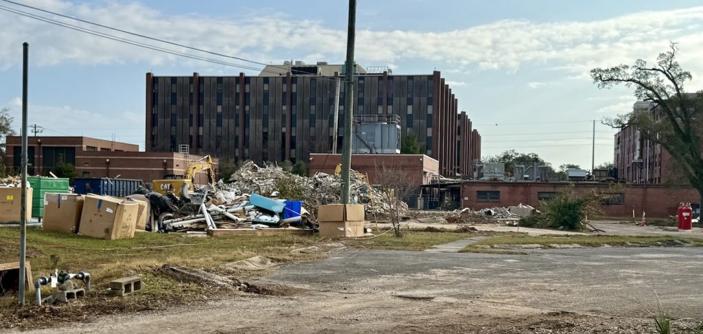 The demolition team is containing the asbestos through negative pressure systems, sealed work zones, a solvent-based removal process to prevent fibers from becoming airborne, and High-Efficiency Particulate Air (HEPA) filtration, which removes 99.97% of particles. Only 7.8% of the asbestos-containing material is being removed off-site and will be routed to landfills permitted to accept asbestos — Perdido Landfill and Timberlands Landfill in Brewton, Alabama.