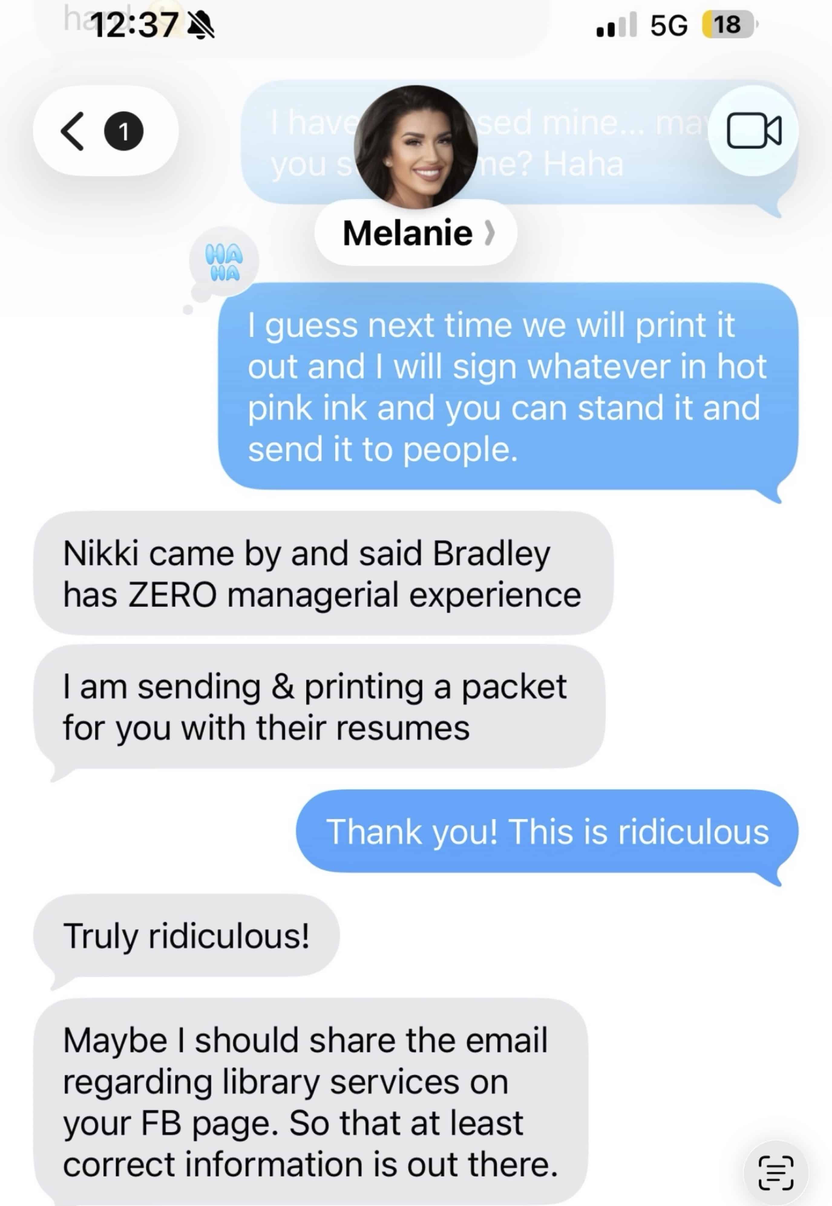 Human Resources Director Nikki Powell apparently joined in. Luna texted Hofberger: “Nikki came by and said Bradley has ZERO managerial experience.”
