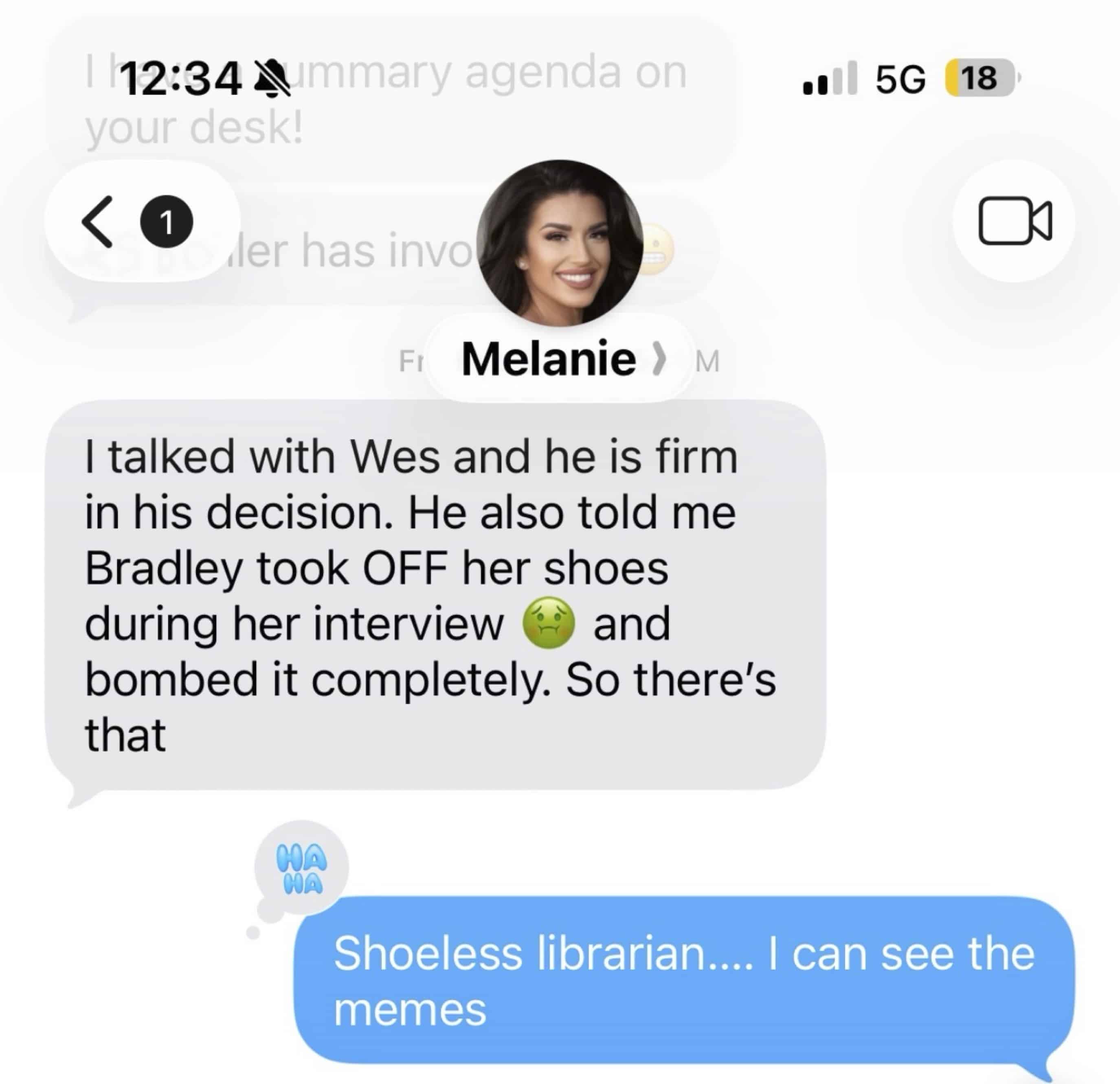 Luna texted Hofberger: “I talked with Wes, and he is firm in his decision. He also told me Bradley took OFF her shoes during the interview * (Green-faced sick emoji) and bombed it completely. So there’s that.”