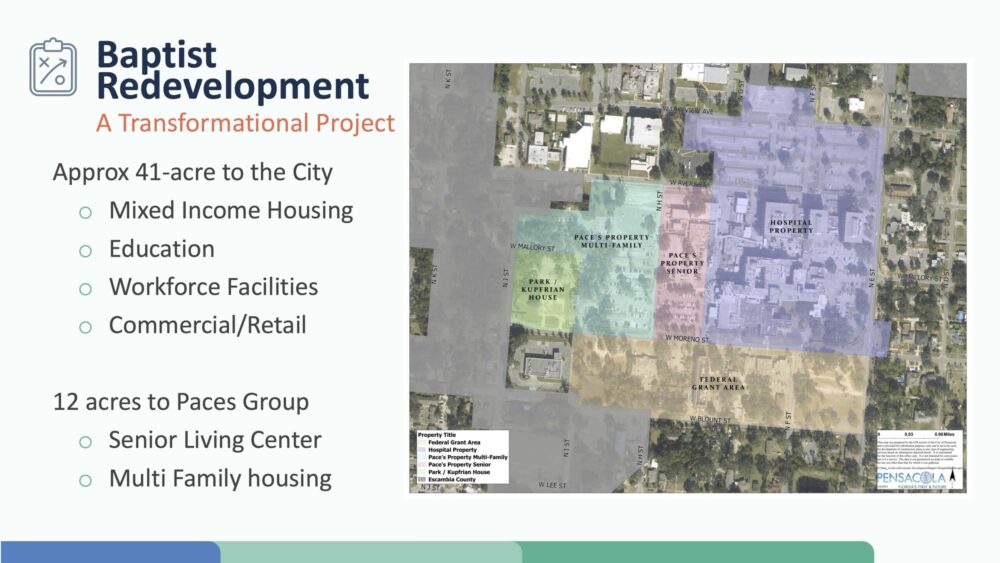 - After two years of due diligence, the City of Pensacola officially closed on the Baptist Legacy Campus property last week. Economic Development Director Erica Grancagnolo thanked the city’s legal team for making “what was very complicated feel seamless.”