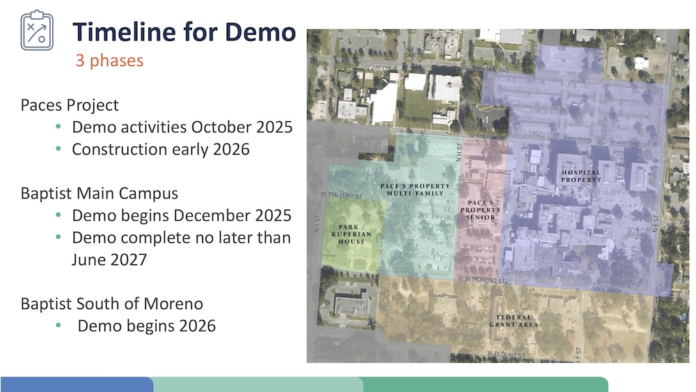 The campus redevelopment involves several concurrent projects. Paces Development will begin demolition and construction within the next couple of weeks on 11 acres they purchased from Baptist before the city’s acquisition. Their projects include multifamily low-income housing and senior housing developments.