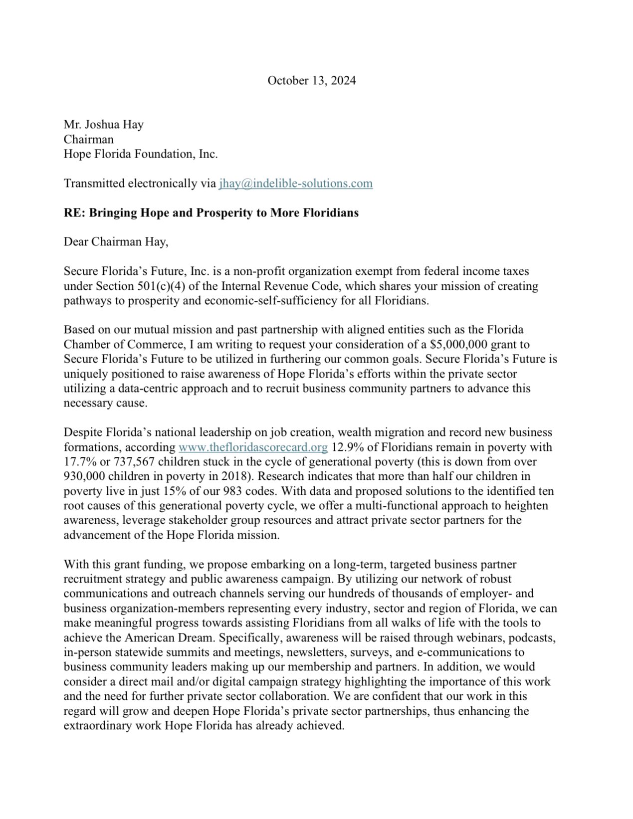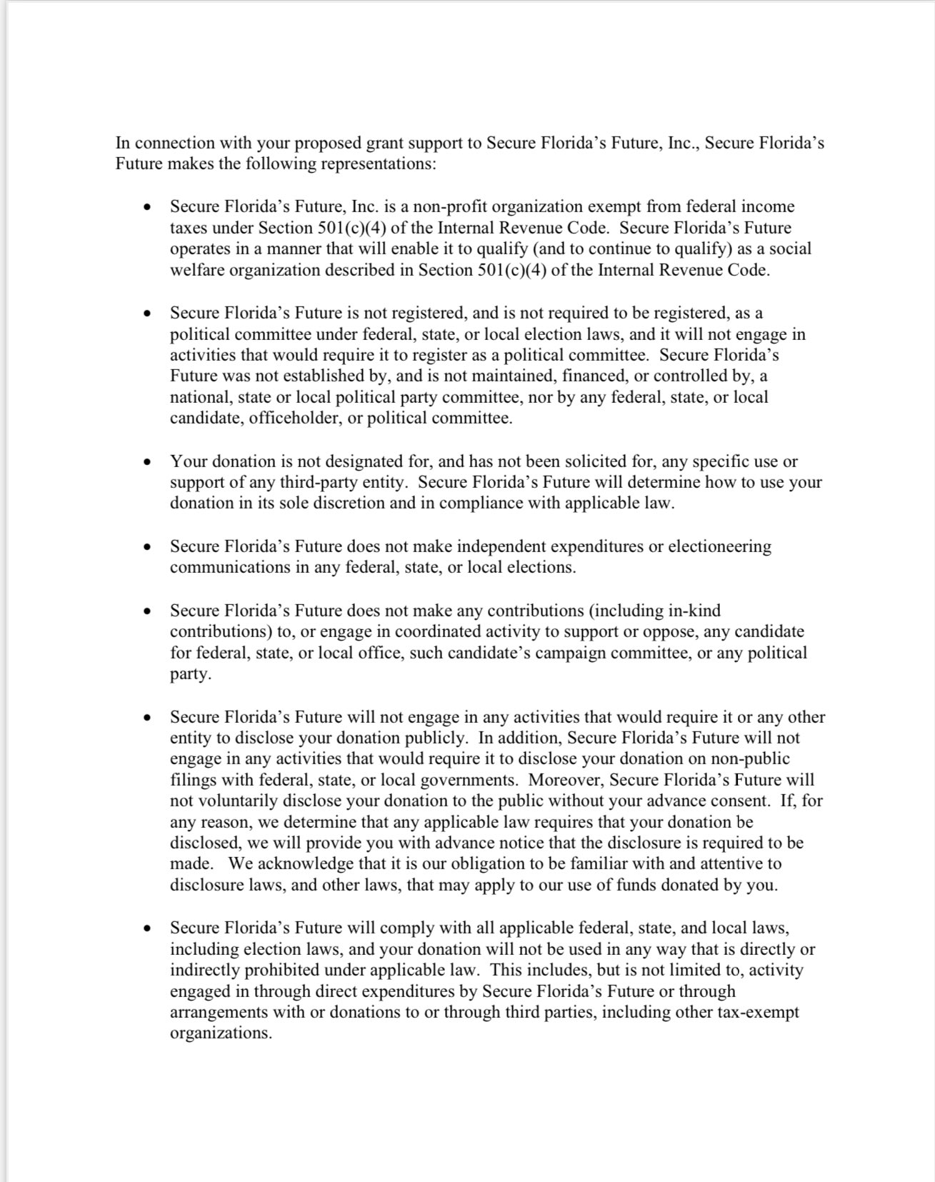 We have received a copy of the $5 million grant request made by Secure Florida’s Future, a 501(c)(4) nonprofit.