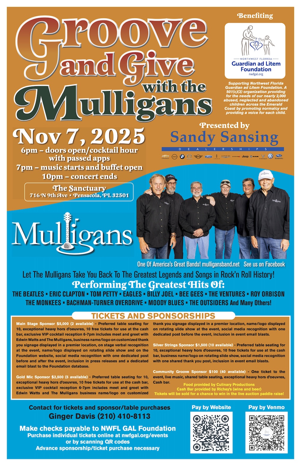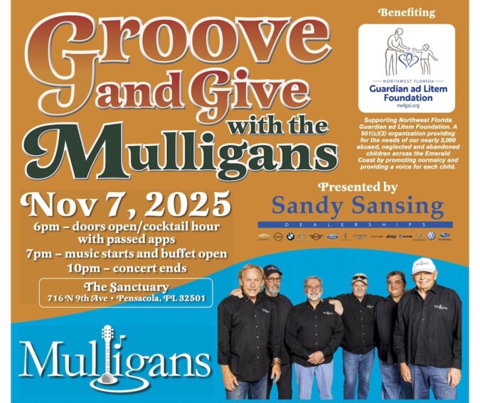 Guardian ad Litem Foundation has a major fundraiser next month—“Give and Groove” with the Mulligans on Friday, November 7, at The Sanctuary, 716 N. 9th Ave. Culinary Productions will provide food.