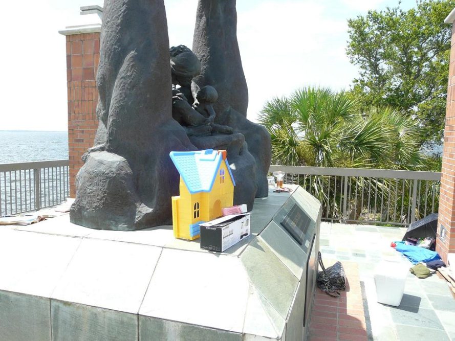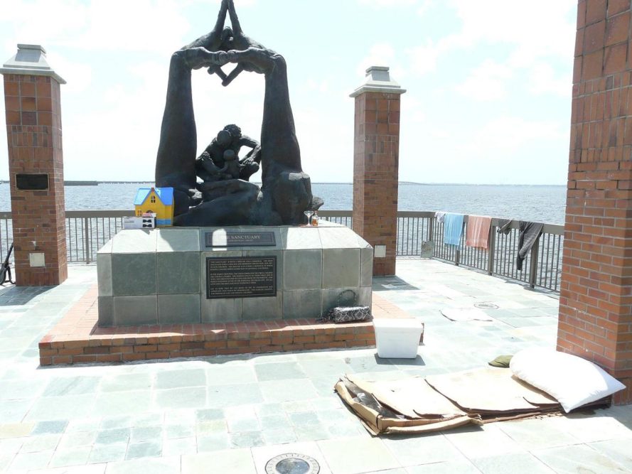 Completed in 1996, a pedestrian bridge leads out to an observation deck on an inlet where a bronze statue, “Sanctuary,” by Sam Nettles, rests. The site was supposed to be a place of solace for those mourning their missing children. Instead, it has become a haven for the homeless, who often spend the night on beds made of cardboard after a day of panhandling.