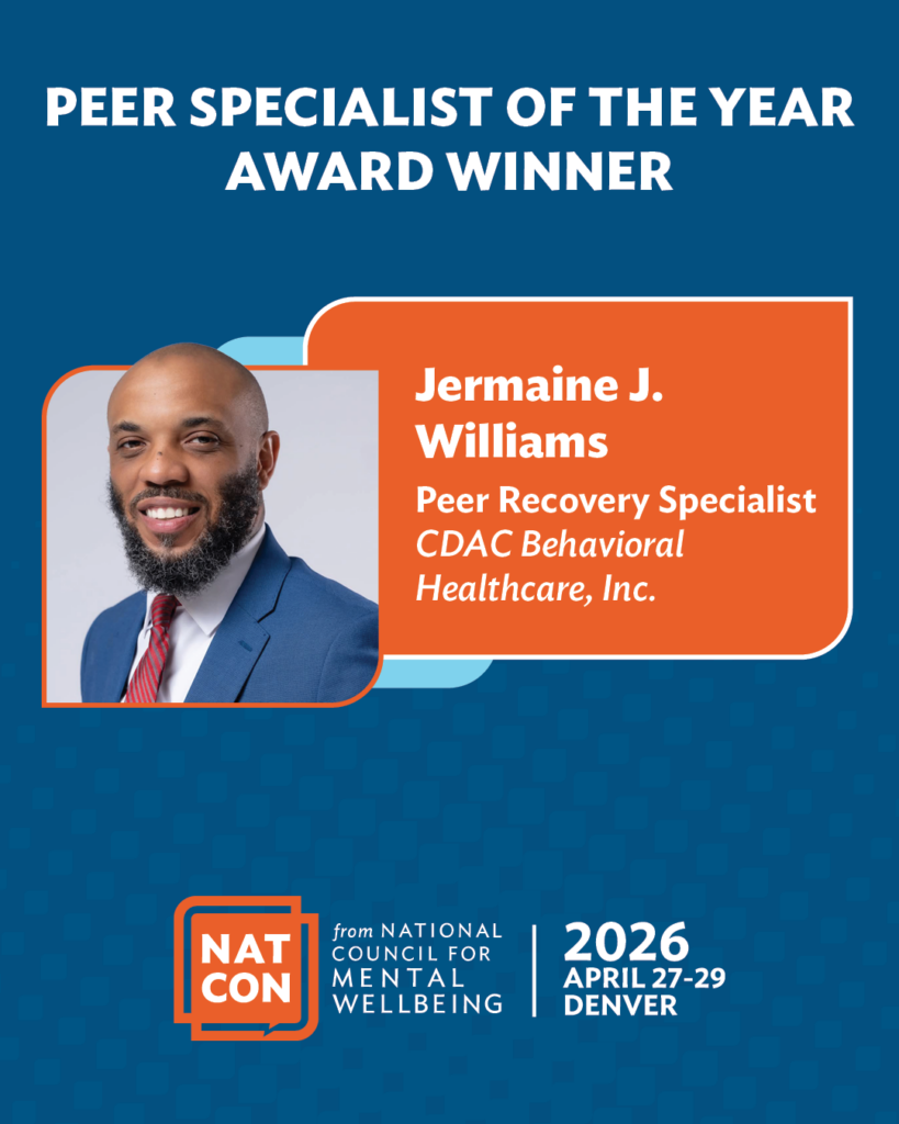 - The National Council for Mental Wellbeing has named Jermaine J. Williams the 2026 Peer Specialist of the Year. National Council President and CEO Chuck Ingoglia will present the award, part of the organization’s annual Awards of Excellence at NatCon, the nation’s largest behavioral health conference in Denver in late April.