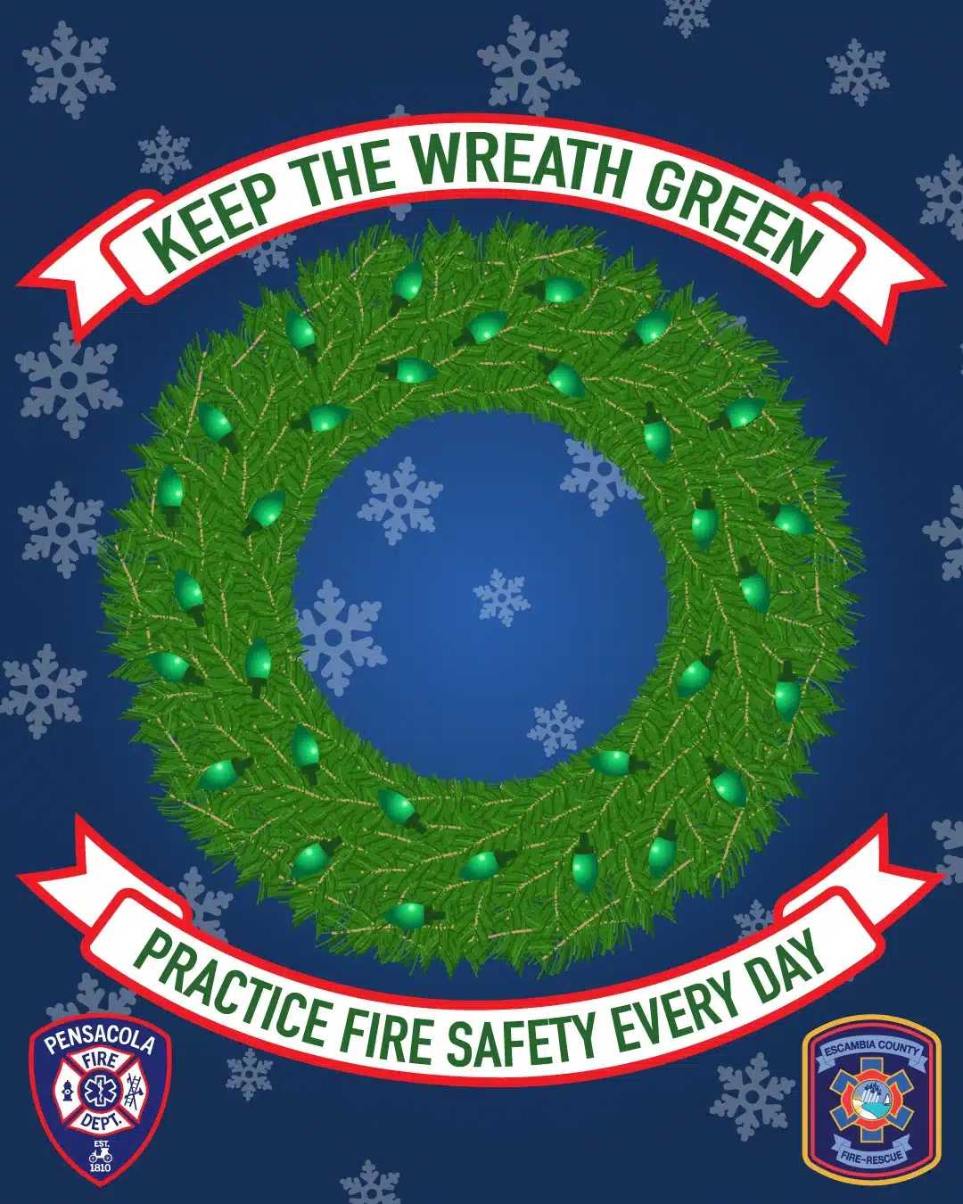 Escambia County Fire Rescue, in collaboration with the Pensacola Fire Department, launched its annual “Keep the Wreath Green” fire safety campaign Monday, Dec. 1. While a joyous time of year, cold weather, holiday decorations and festivities can create serious fire dangers. Firefighters hope to reduce the number of fires by promoting simple, life-saving holiday safety tips each day in December.