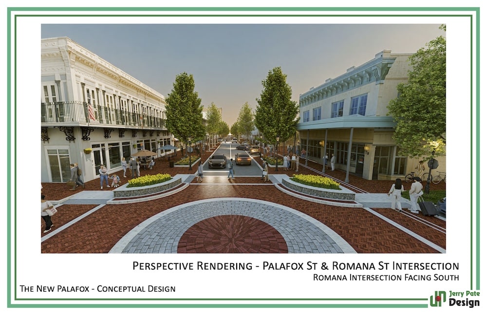 Background: Reimagining Palafox is a $10.3-million streetscape transformation focused on improving safety, walkability, and aesthetics across the four blocks between Garden and Main streets. Designs include narrowing car lanes, widening sidewalks, and incorporating enhancements such as mid-block crossings, pervious pavers, and planting 51 new canopy trees for a net positive.