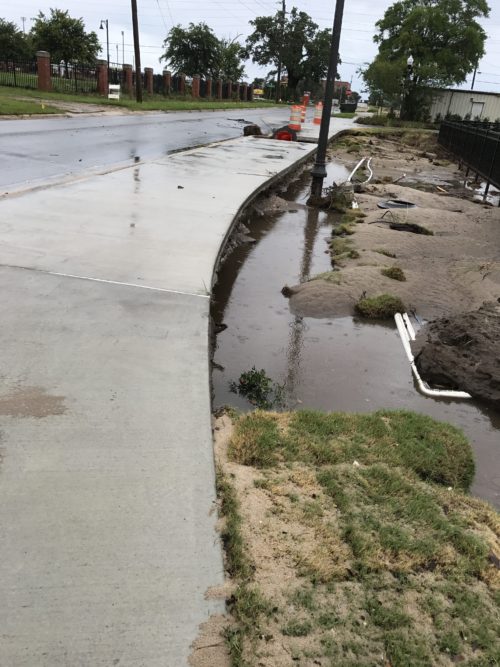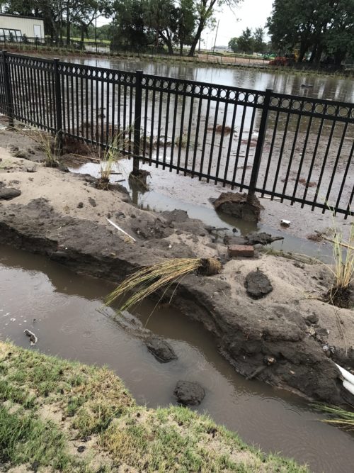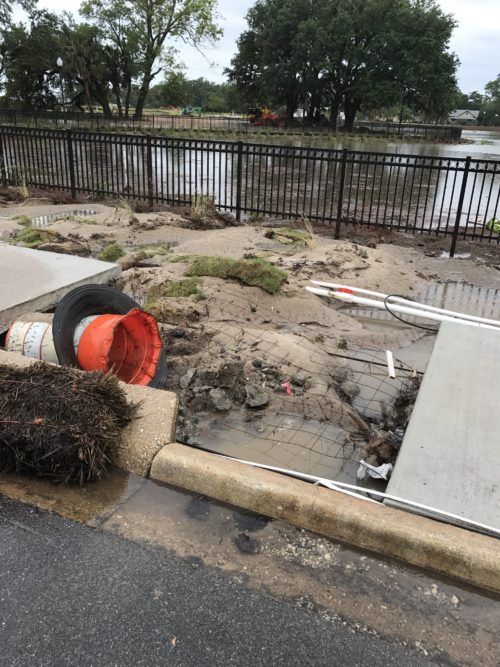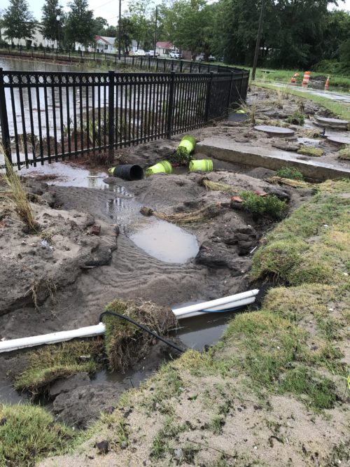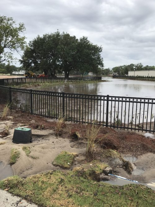 We drove over to the Government Street Stormwater Pond, which is two blocks west of Pensacola City Hall. The easternmost end of the pond has eroded the sidewalk and iron fencing.