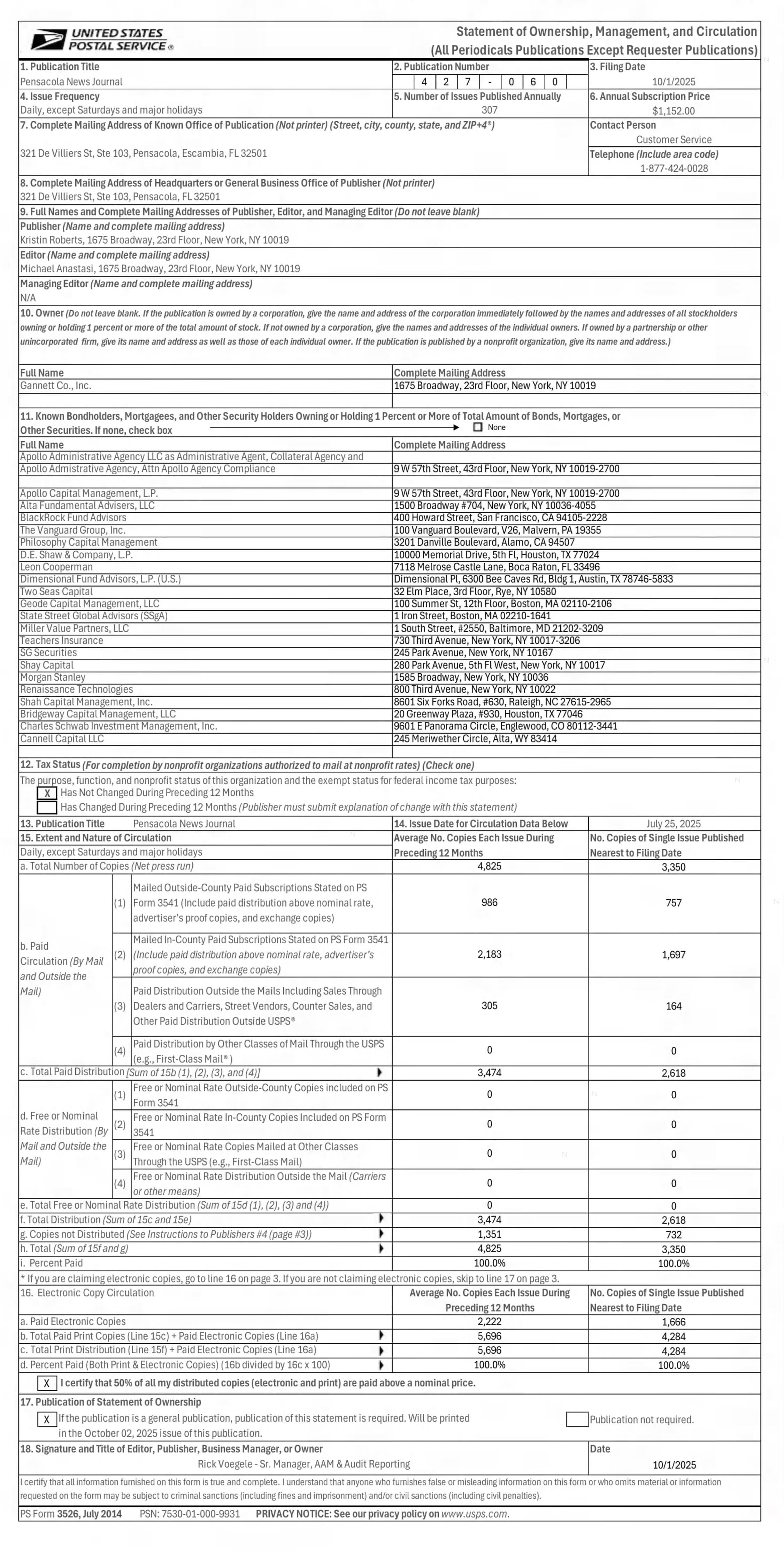 On Friday, July 25, 2025, the PNJ had a new print run of 3,350 copies. Only 1,697 were paid subscriptions in Escambia County. Click to enlarge report.