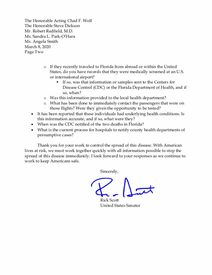 Scott asked that information about the inbound and outbound flights of the affected individuals in Lee and Santa Rosa counties be released. He also requested any records concerning medical screening at U.S. or international airports, underlying health conditions, when CDC was notified of the deaths, and the current process for hospitals to notify county health departments of presumptive cases.