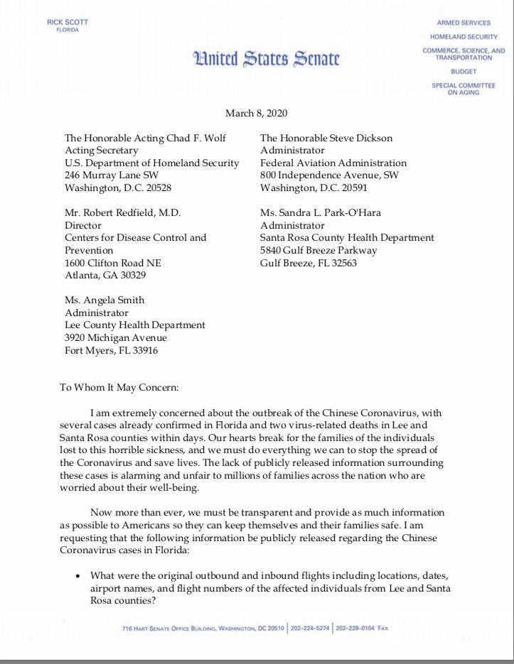 The deaths of residents of Lee and Santa Rosa counties due to the coronavirus last Friday were the first two outside of the state of Washington at the time. U.S. Senator Rick Scott has fired off at letter to federal and state officials and the health administrators of the two Florida counties demanding more transparency. Note: He also calls the virus the “Chinese coronavirus.” *