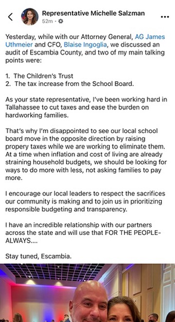 Her Facebook post led with “Yesterday, while with our Attorney General, AG James Uthmeier and CFO, Blaise Ingoglia, we discussed an audit of Escambia County,…”
