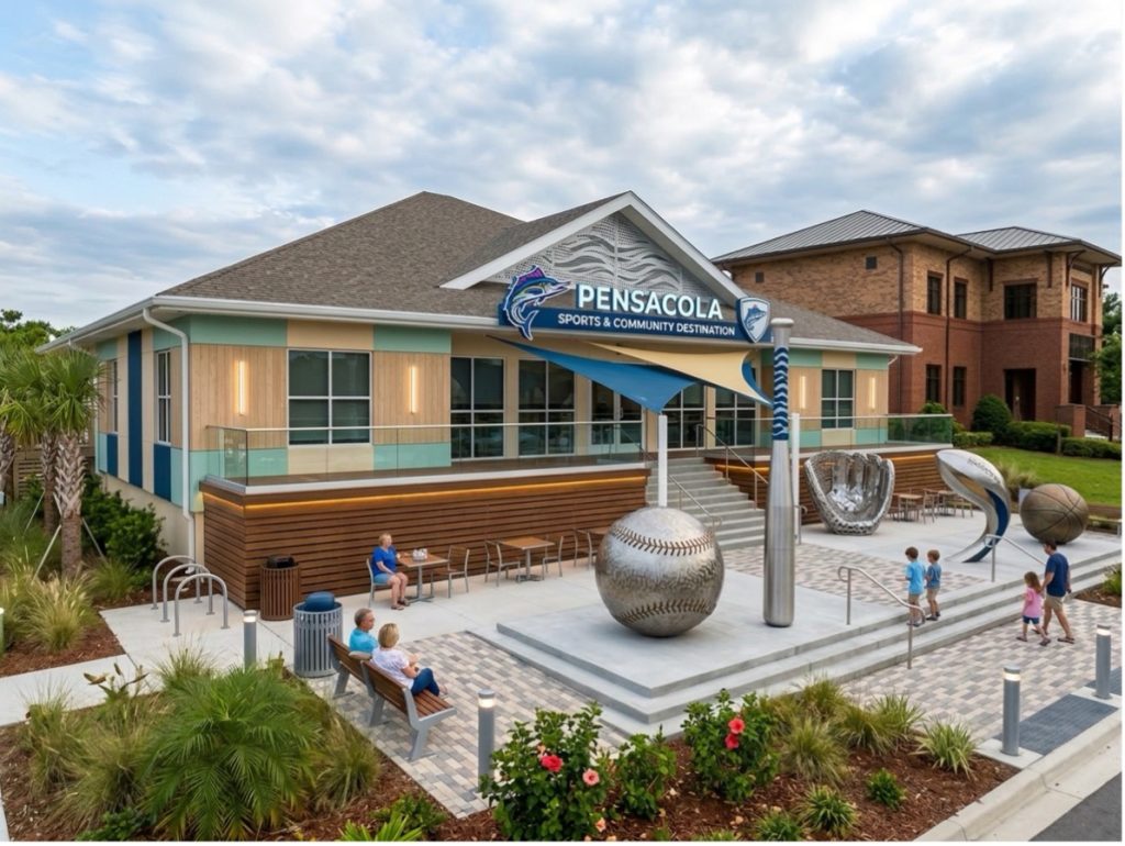 Inside, the plan calls for industrial-chic concrete floors, recessed lighting, interactive digital tablets that let visitors explore stats and stories of Pensacola’s professional athletes, and high-security glass vault cases showcasing jerseys and equipment from the city’s greatest sports moments. A “Community Lounge” would serve as a third space for residents, anchored by a “Pin Your Hometown” fan map tracking the geographic reach of Pensacola visitors.