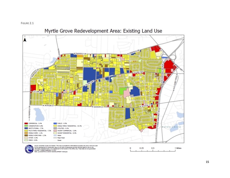 Land Use and Housing: Myrtle Grove is overwhelmingly residential, with 82.3% of its 1,743 acres dedicated to housing. Single-family homes dominate at 63.4% of total land use, while 8.2% sits vacant and available for redevelopment. The area also contains significant institutional uses (7.7%), including Escambia High School, Myrtle Grove Elementary, and numerous churches.